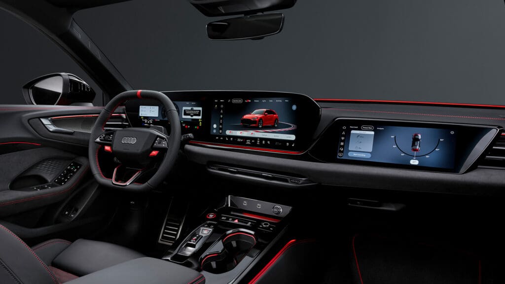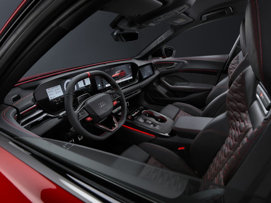 Inside both versions, the RS identity continues. The curved MMI Panorama display integrates an 11.9 inch virtual cockpit and a 14.5 inch central touchscreen, complemented by a 10.9 inch passenger display as standard.