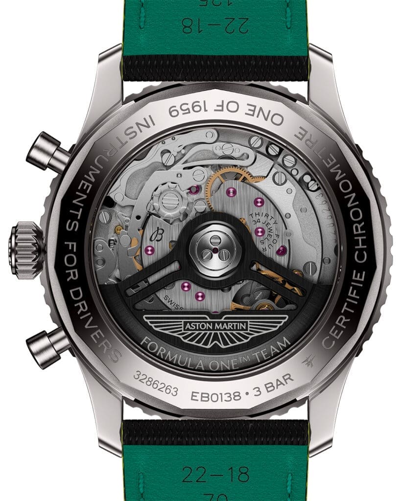 A lightweight titanium case, carbon fiber dial, and racing green accents echo the materials and colors of the F1 cockpit. Inside beats the Breitling Manufacture Caliber 01, a COSC certified chronometer with a 70 hour power reserve, visible through an open sapphire caseback engraved with “Instruments for Drivers”.