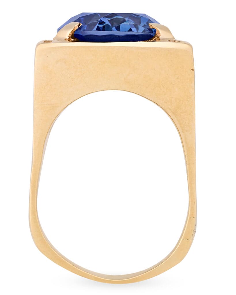 The ring is crafted in 14K yellow gold and set with a striking blue synthetic sapphire, chosen specifically for its ability to catch and reflect stage lighting. Under concert spotlights, the stone would have appeared almost electric – a detail that aligned perfectly with Elvis’s flair for drama and visual impact. The design is unapologetically bold, architectural, and unmistakably of its era, embodying the confident masculinity and showmanship that defined Elvis’s public image.