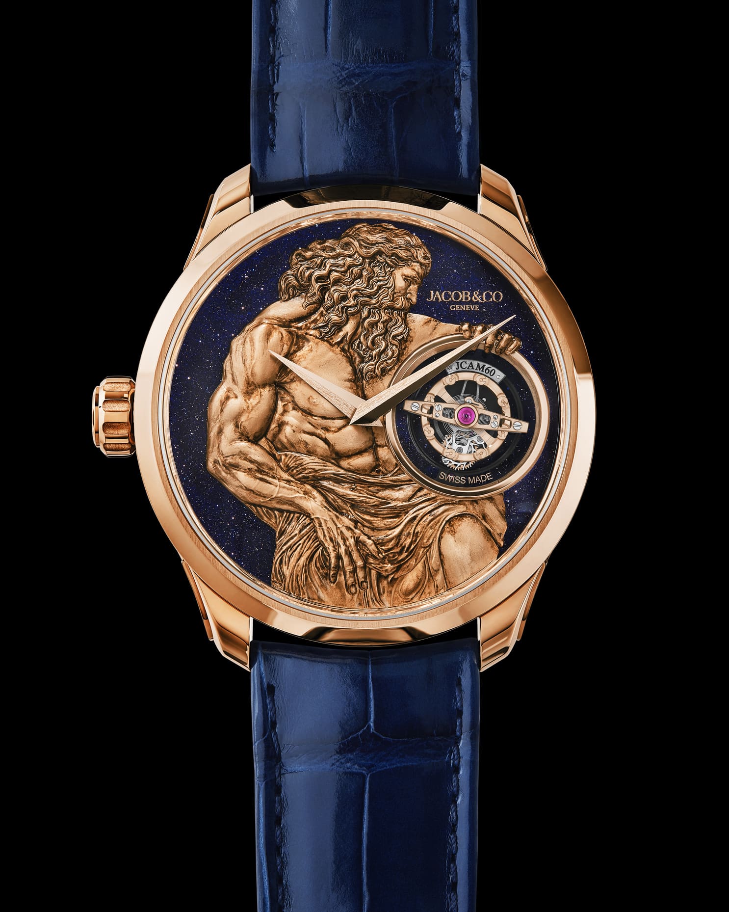 The dial is dominated by the figure of Chronos, the ancient god of time, rendered as a three-dimensional rose gold sculpture. He is not ornamental. He is central, both visually and conceptually. Set against a deep blue aventurine sky, the composition creates a sense of space and distance, reminding the wearer that time here is treated as a force rather than a function.