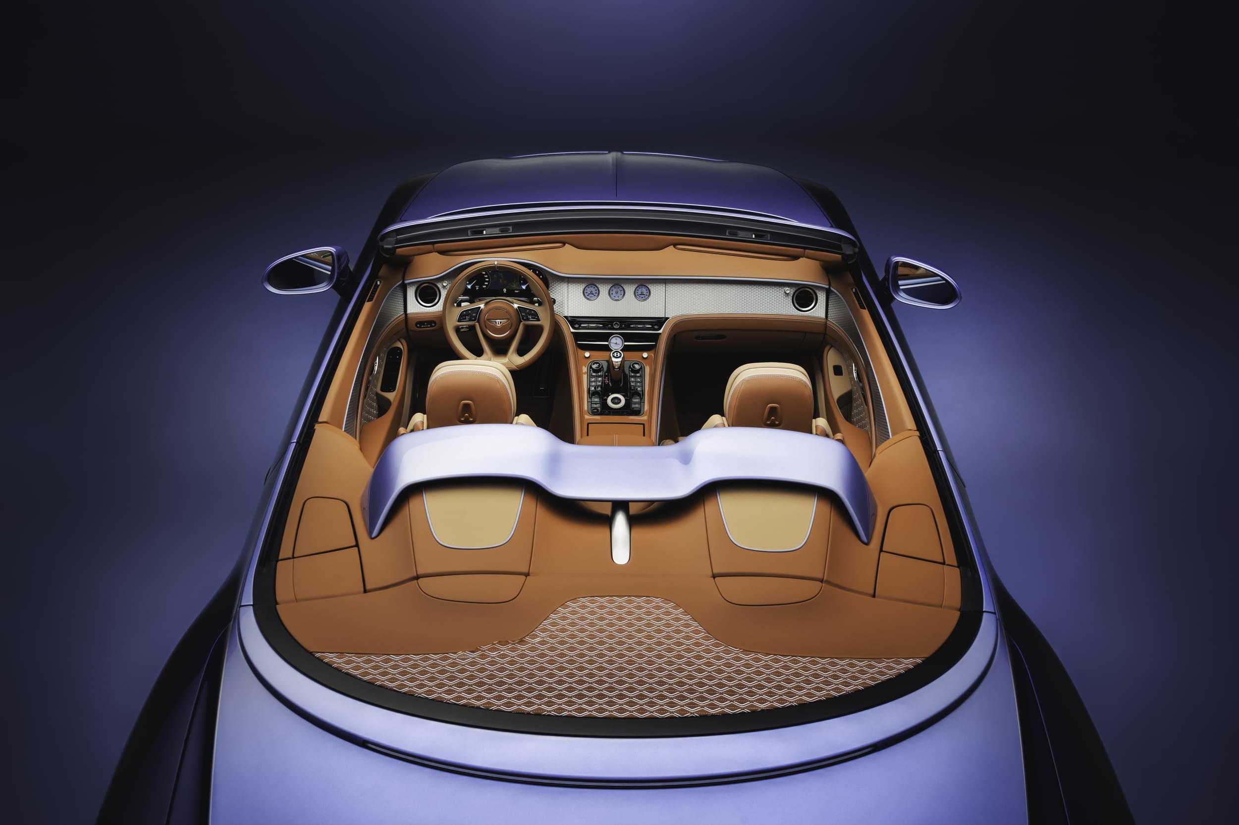 Inside, the palette warms to tans and caramels, lifted by the familiar light blue that pulls the Breslow Blue Airbridge into the cabin. The stitching flows from the tonneau through the seats and headrests to the instrument panel, which keeps the eye moving without shouting for attention. The deep-pile mats hide an outline of the Batur volcano if you know where to look. The engine-turned aluminium fascia catches sunlight in tight, period-correct spirals, while the Rotating Display wears bespoke gauge faces and a satin blue clock that quietly telegraphs the theme.