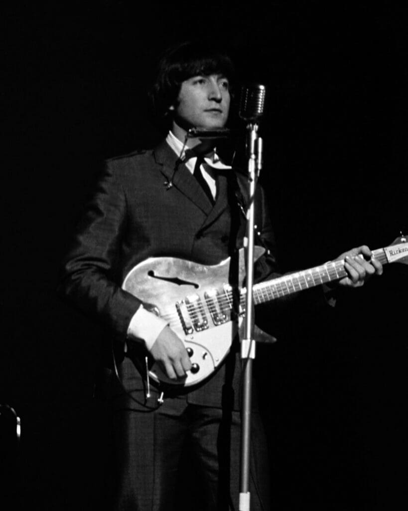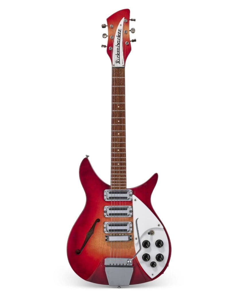 The Beatles thread here is woven with precision rather than sentiment. John Lennon’s Rose-Morris Rickenbacker, a sunburst semi-hollow that replaced a damaged 325 in late 1964, then went to Ringo Starr in 1968 to encourage songwriting, captures the band in transition rather than on a greatest-hits loop. More indelible still is Ringo’s Ed Sullivan Show drum head, stark white with Ludwig script and The Beatles logotype, lit cold by television lamps on 9 February 1964 as 73 million Americans tuned in. That head is estimated at 1 to 2 million dollars, and rightly so. It is an image as much as an instrument.