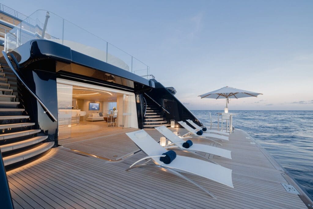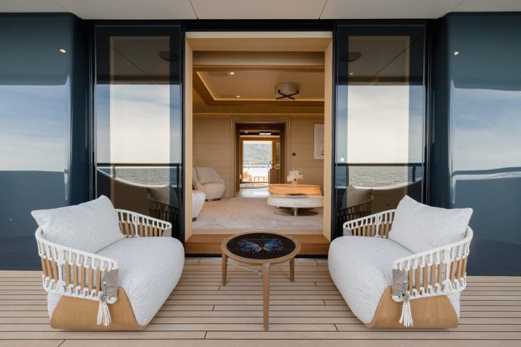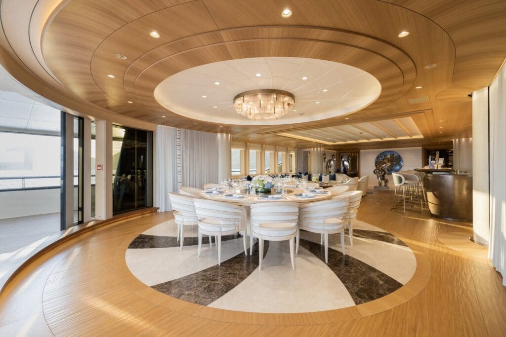 The experience is obvious the moment you picture the day. Touch down by helicopter with the rotors easing to a hush, transfer inside within steps, then move to the pool where the only sound is water running over the edge. Interiors are designed for space and flow rather than stunts. Private terraces off the VIPs change the morning routine from a corridor to a breath of salt air. The beach club’s shell doors connect guests directly to the sea, which laps quietly at the platform. It is the kind of arrangement that reduces the choreography of large-yacht life.