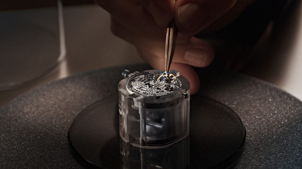 Then there is the little spectacle at six. Beneath an arc-shaped 20-second scale, three blue hands mounted on the tourbillon cage take turns to mark 20-second intervals as the cage completes a rotation every 60 seconds. It is a quiet piece of theater that feels earned rather than showy.