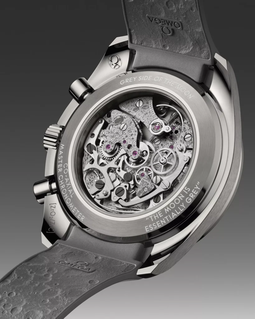Movements are equally considered. The range introduces a slimmer manual-winding expression with the Black Edition Co‑Axial Master Chronometer 9908, identifiable by a full matte dial with grey and red transfers and a red central chronograph hand. Automatic fans get the Co‑Axial Master Chronometer 9900, which also appears in a blacked‑out “Black Edition” treatment with darkened components. The space historian’s piece is the Apollo 8 tribute, powered by the Co‑Axial Master Chronometer 3869. Here, OMEGA leans into narrative without resorting to gimmicks. The movement and dial reveal a laser‑ablated lunar surface, with the near side visible through a skeletonised grey dial and the far side appearing through the caseback, echoing Jim Lovell’s succinct verdict from Apollo 8 that the Moon is essentially grey. Across the board, Master Chronometer credentials, Co‑Axial escapements, and four years of development in ceramic finishing underpin the technical brief. Water resistance is not specified in the release.