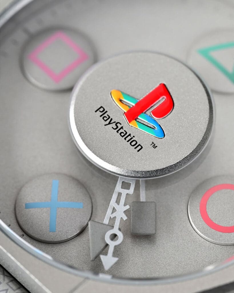 The matte-grey palette pays homage to the 1994 console, while the △ ○ × □ symbols – long embedded in gaming language – appear as refined graphic cues rather than overt branding. The crown echoes the classic power button, creating a tactile connection between player and product.