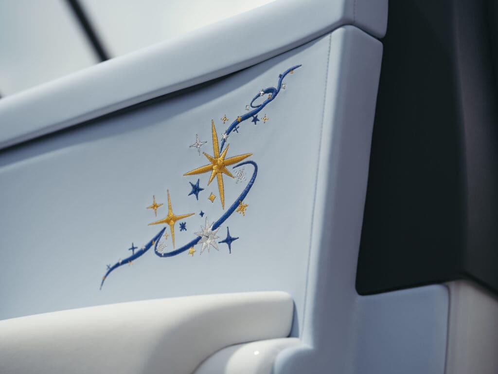 Open the doors and the palette goes polar. Charles Blue and Grace White leathers recline across the seats with matching piping and stitching. Piano White veneers give the cabin a clinical crispness, like satellite hardware polished for launch. The family who commissioned the car, inspired by their young son’s fascination with space, worked with designers on a bespoke Star Cluster motif. You find it embroidered on the door cards and headrests, then again, hand-painted on the passenger fascia. It is cohesive but not shouty, which is not always a given in the world of six-figure custom interiors.