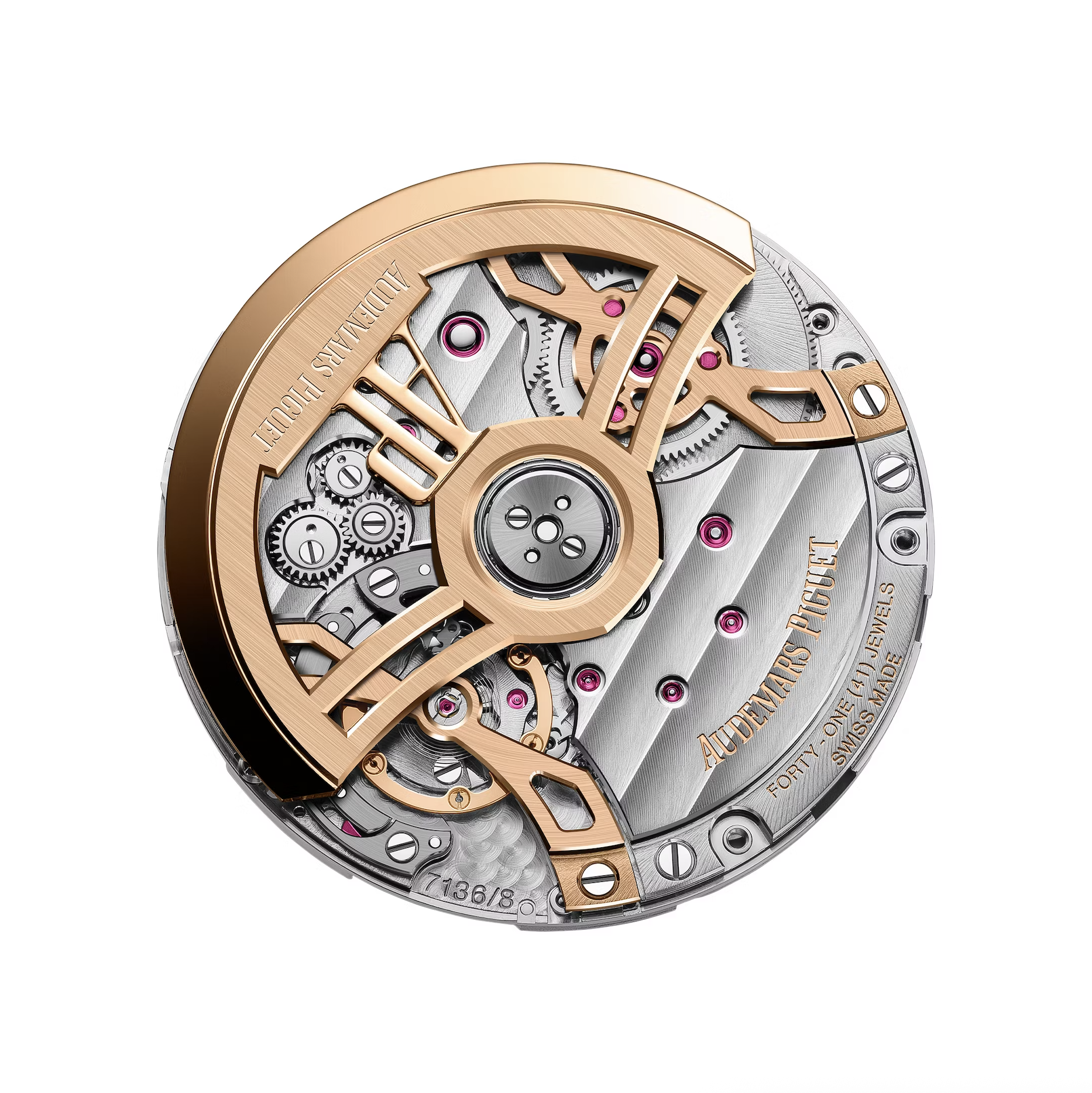 Inside is the new selfwinding Calibre 7136. It runs at 4 Hz, offers a 55-hour power reserve, and is built from 413 components with 41 jewels. The movement drives the full complication set: day, date, month, leap year, astronomical moon, hours and minutes. Three patented mechanisms improve reliability, while adjustment is performed entirely via the crown. This eliminates the need for case correctors or specialized tools, a small but significant improvement for owners.