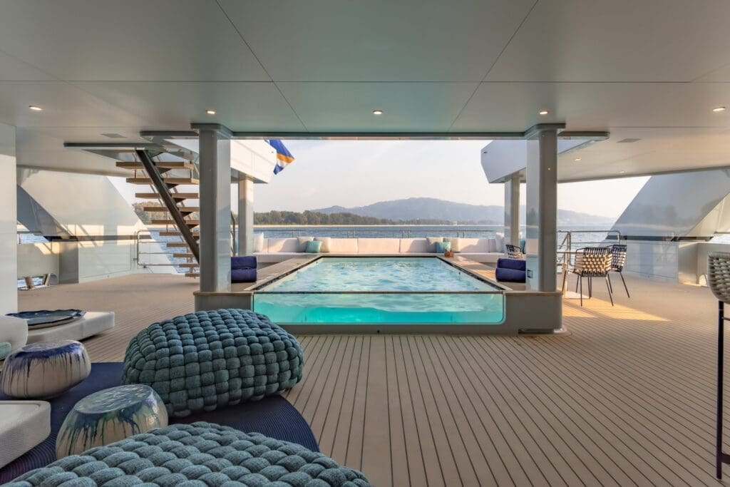 The fundamentals are simple. SPACECAT is 35.9m, 117.8ft in old money, and she looks it, a sleek profile that stays futuristic without tipping into novelty. Her interiors are modern without being gallery-cold, more restrained apartment than nightclub, which matters if you plan to live aboard for more than a long weekend. It’s a boat designed for time together, not corridors and corners.